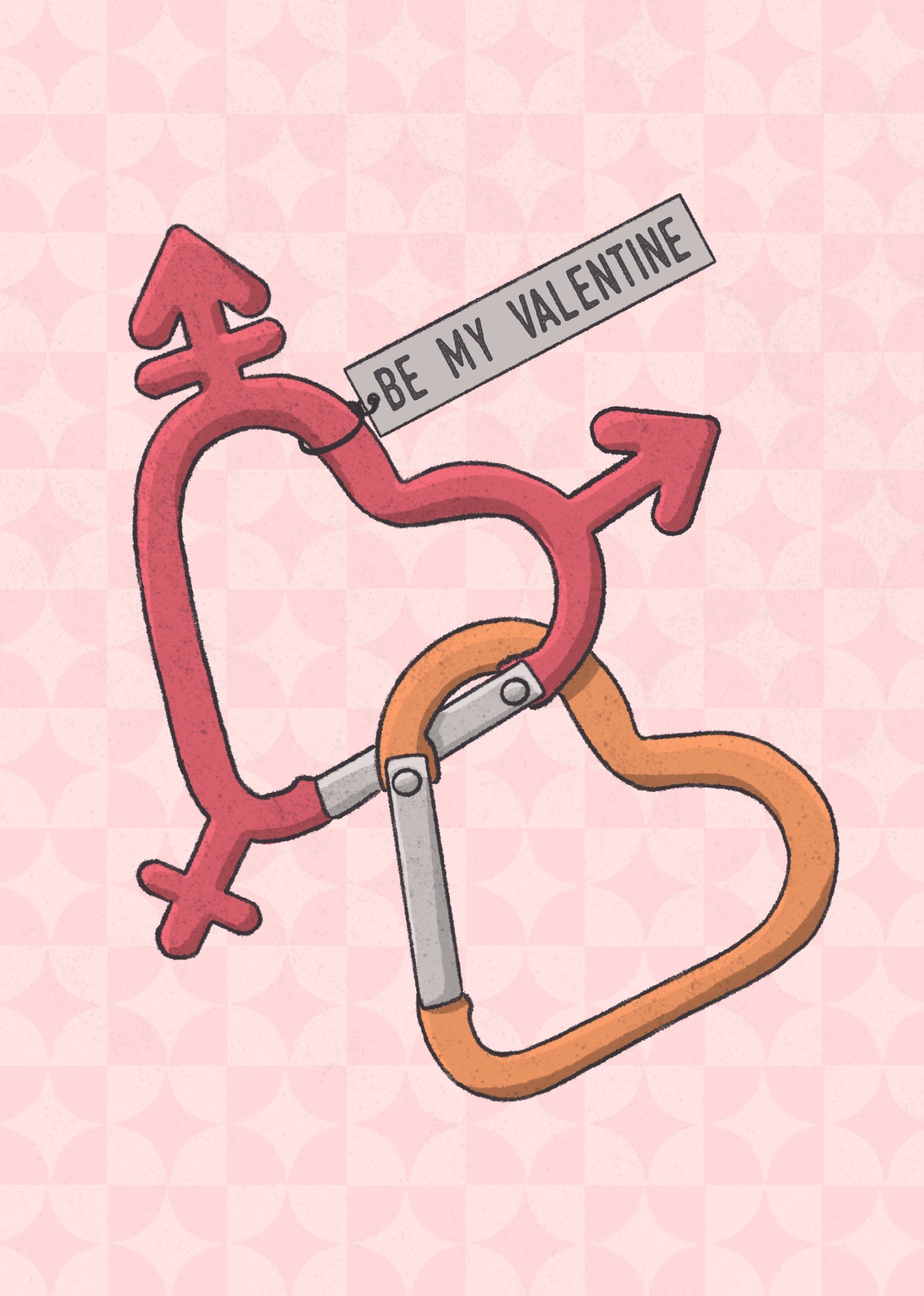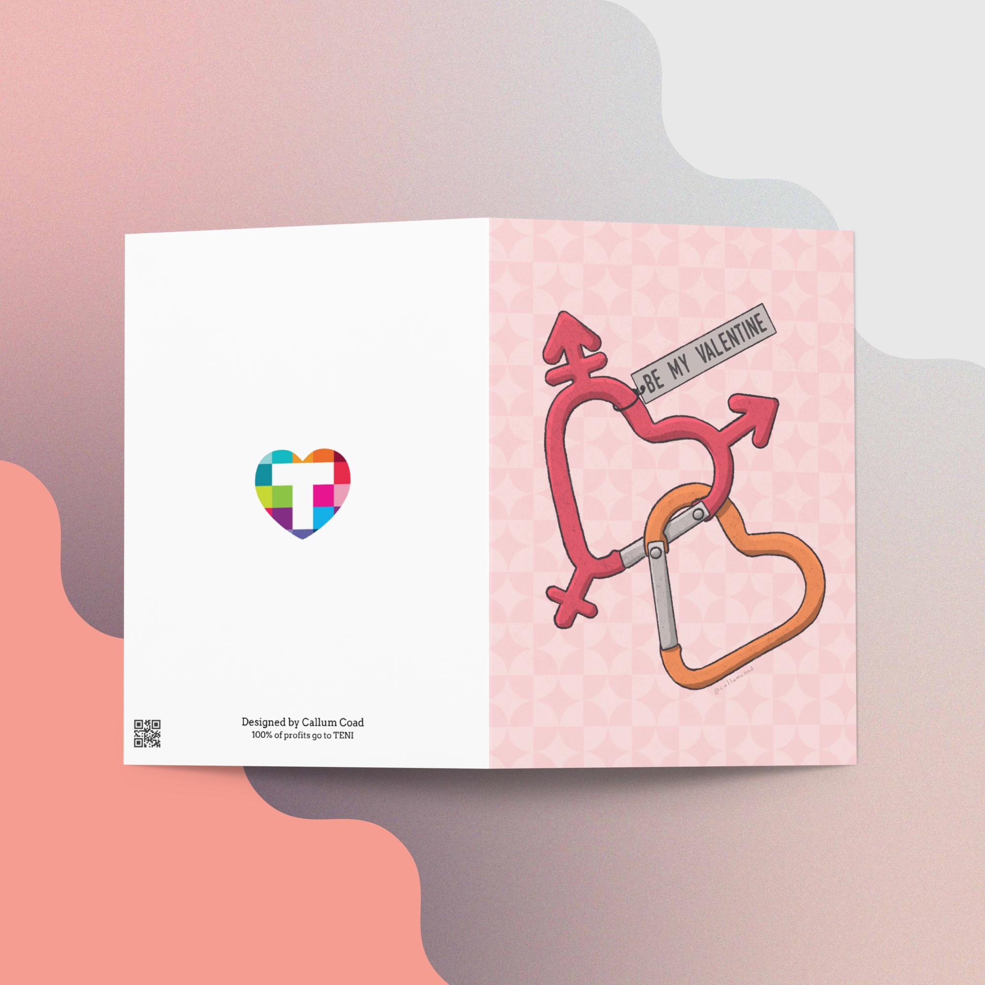 Image description: Valentine’s Day card with two heart shaped carabiners linked together. One of the heart carabiners also has the shape of the transgender symbol (⚧) and a label saying “Be my valentine”. The background of the card is pink and patterned. The back of the card has a heart-shaped TENI logo and text reading “Designed by Callum Coad”. The card sits on a pink-blue gradient background.